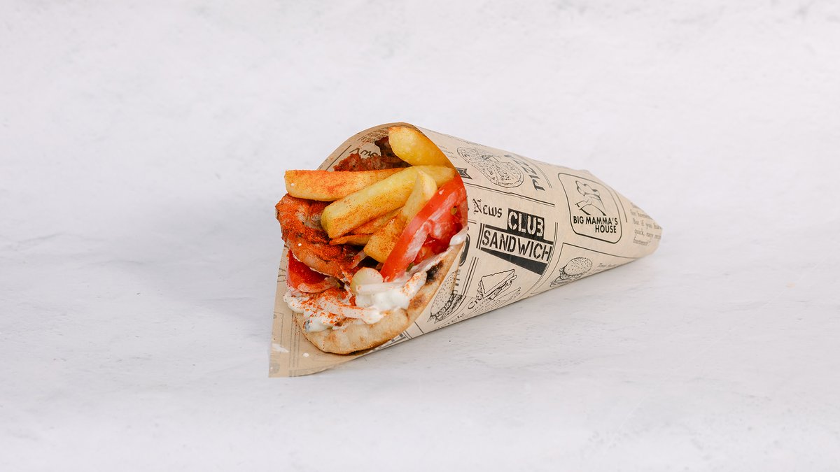 Συνοδεύεται από πατάτες τηγανητές, ντομάτα, κρεμμύδι, τζατζίκι και πίτα
