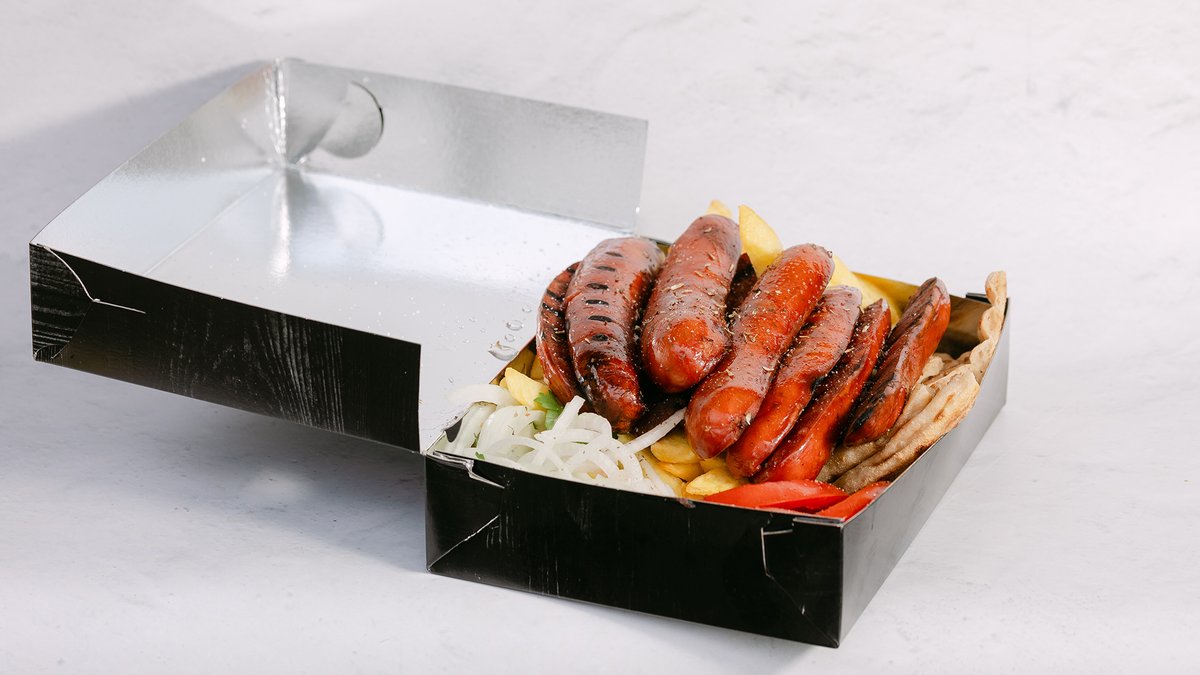 Συνοδεύεται από πάριζα, gouda, ντομάτα, τυροσαλάτα, μαγιονέζα, μουστάρδα, κέτσαπ, πατάτες τηγανητές, λεμόνι, αλάτι και ψωμί