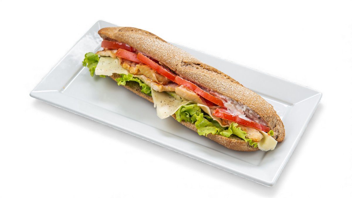Με κοτόπουλο, μπέικον, τυρί gouda, ντομάτα, μαρούλι και μαγιονέζα. Συνοδεύεται από πατάτες τηγανητές