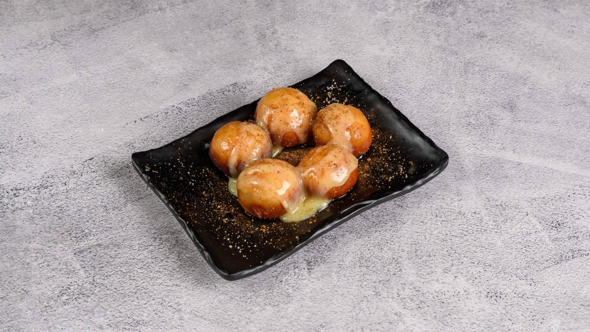 Πέντε μπάλες bao, σιροπιασμένες με επικάλυψη λευκής σοκολάτας, πασπαλισμένες με mix ζάχαρης και κανέλας