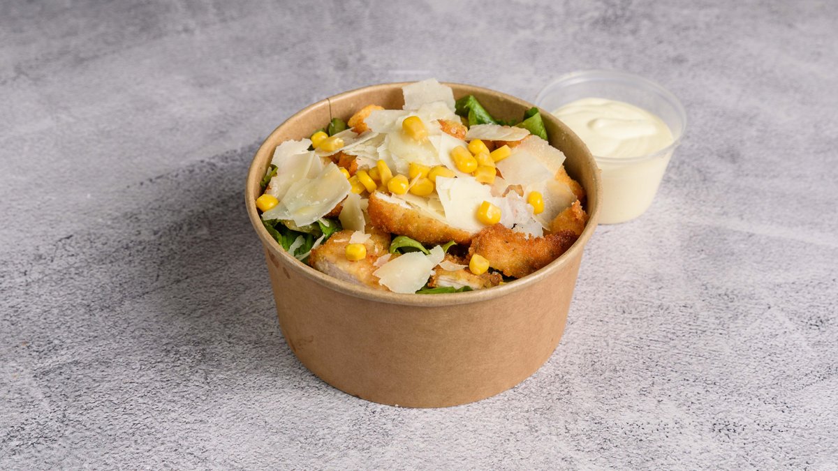 Σαλάτα με μαρούλι, καλαμπόκι, κρουτόν, φιλέτα παναρισμένα κοτόπουλα, Caesar dressing και parmesan flakes