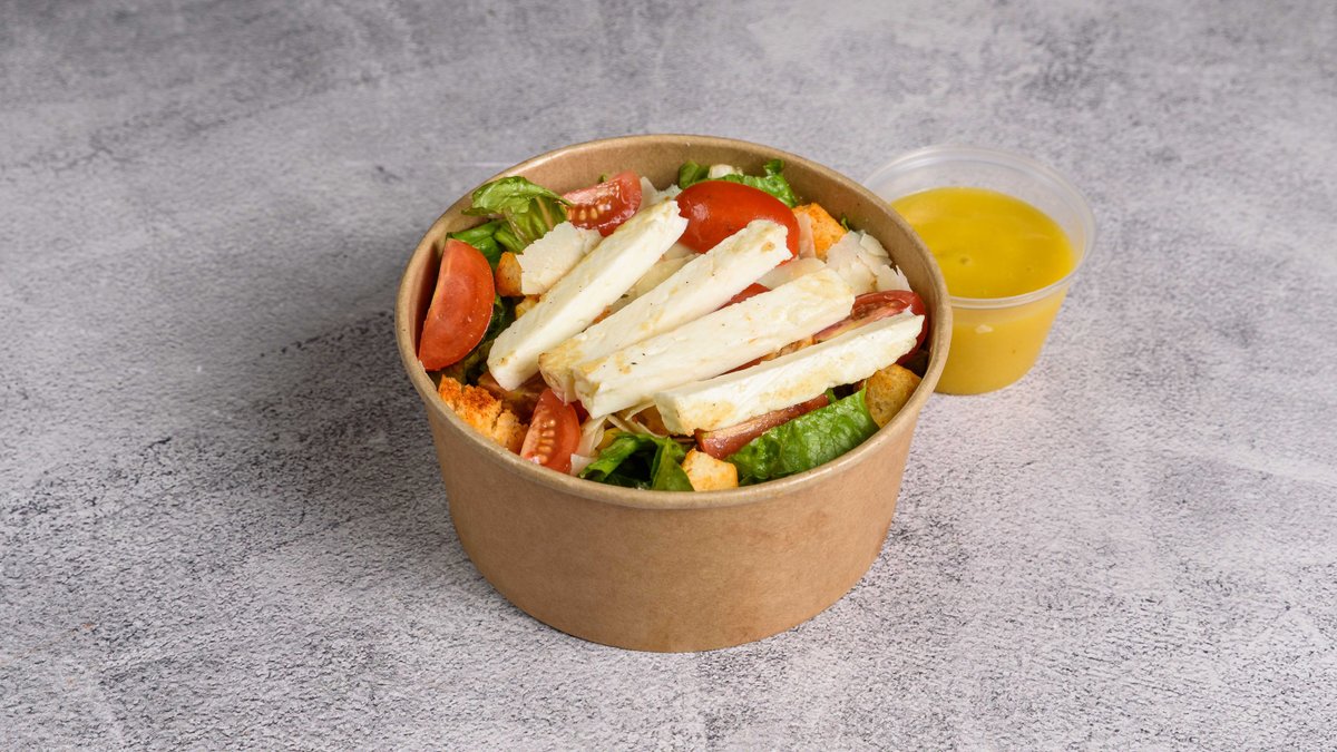 Σαλάτα με μαρούλι, καλαμπόκι, ντοματίνια, κρουτόν, vinaigrette passion fruit, flakes παρμεζάνας και ψημένο χαλούμι