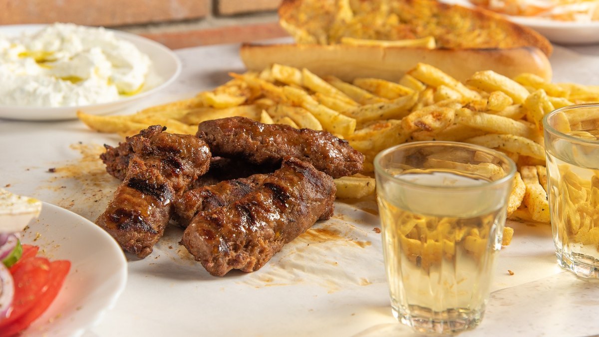 3 τεμάχια μπιφτέκι και 2 τεμάχια λουκάνικο. Συνοδεύεται με φρέσκιες τηγανητές πατάτες και το ψωμί του Μπάρμπα-Μήτσου