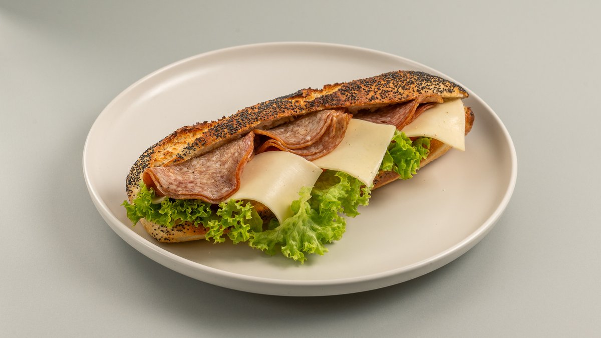 Με gouda, ζαμπόν, ντομάτα, μαρούλι και μαγιονέζα