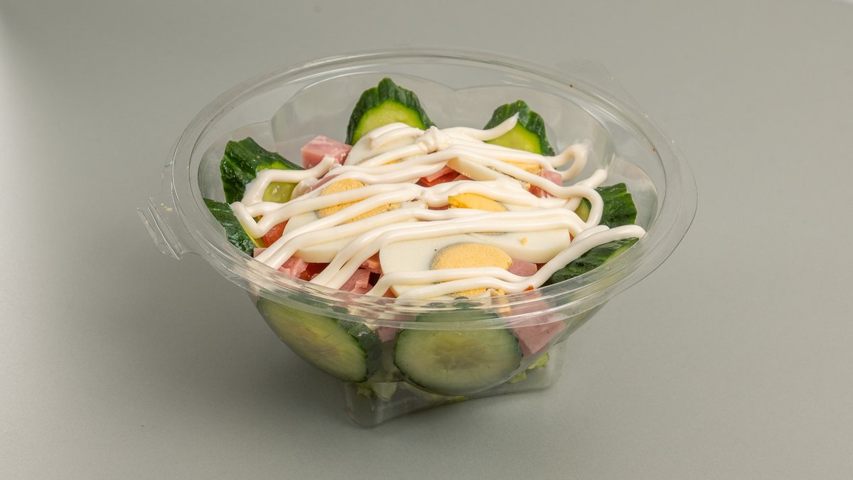 Σαλάτα με μαρούλι, αυγό βραστό, αγγούρι, ντομάτα, ζαμπόν, τυρί και μαγιονέζα