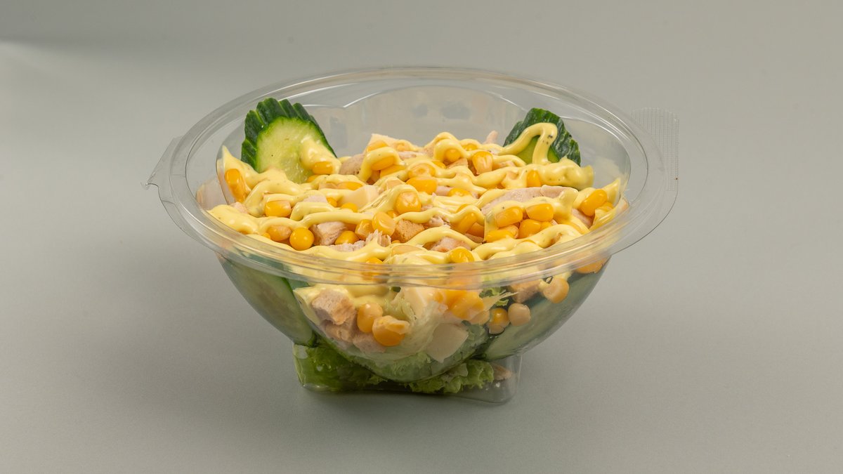 Σαλάτα με μαρούλι, κοτόπουλο, τυρί, κρουτόν, καλαμπόκι, αγγούρι και σως