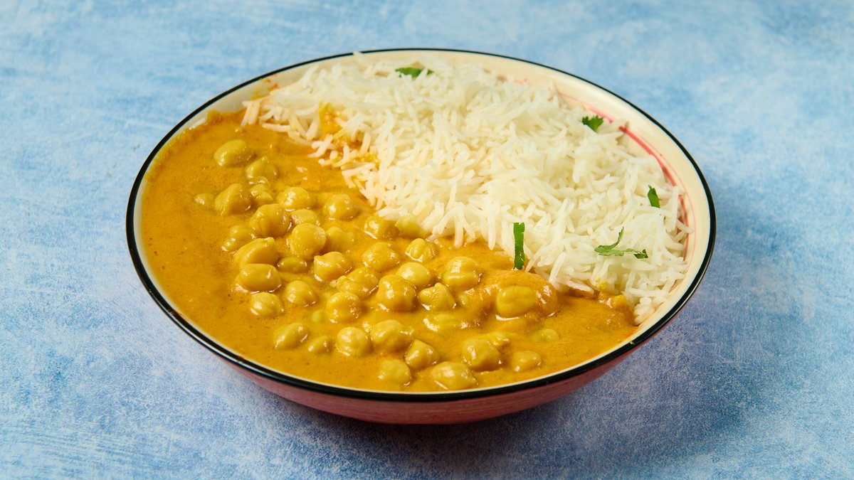 Ρεβύθια μαγειρεμένα με σάλτσα κάρυ. Συνοδεύεται από ρύζι μπασμάτι