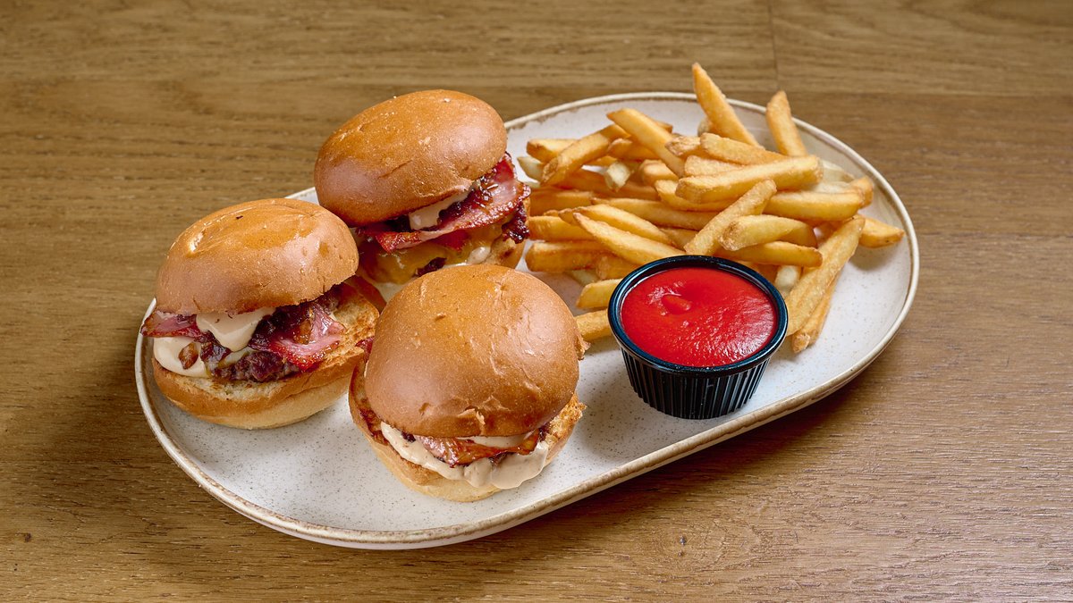 3 mini burgers με μοσχαρίσιο μπιφτέκι,μπέικον,τσένταρ,καραμελωμένα κρεμμύδια ,burger sauce, συνοδεύεται με πατάτες και ketcup.