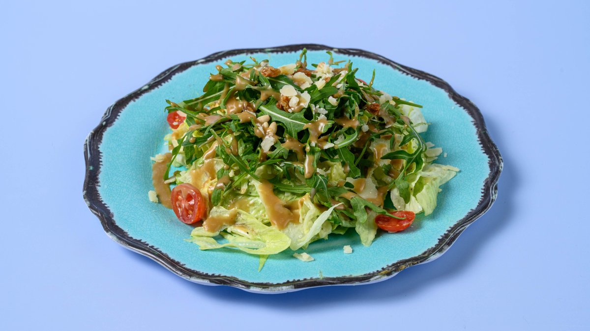 Mix πράσινης σαλάτας, φιλετάκια κοτόπουλο, καλαμπίκο, ντοματίνια, κρουτόν, flakes παρμεζάνας και caesar's sauce