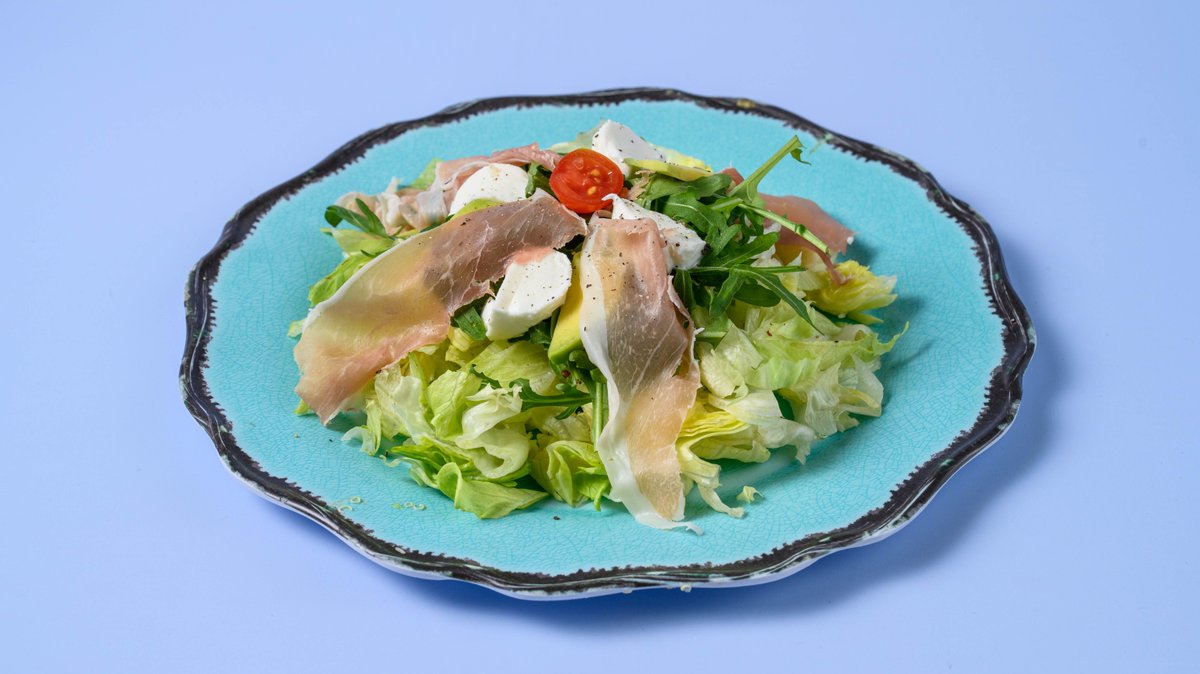 Mix πράσινης σαλάτας, αβοκάντο, προσούτο, μοτσαρέλα και pesto βασιλικού