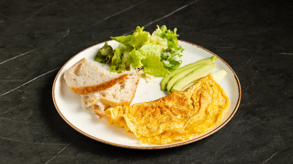 Με 3 αυγά και avocado. Συνοδεύεται από σαλάτα πράσινη ανάμεικτη και ψωμί με προζύμι