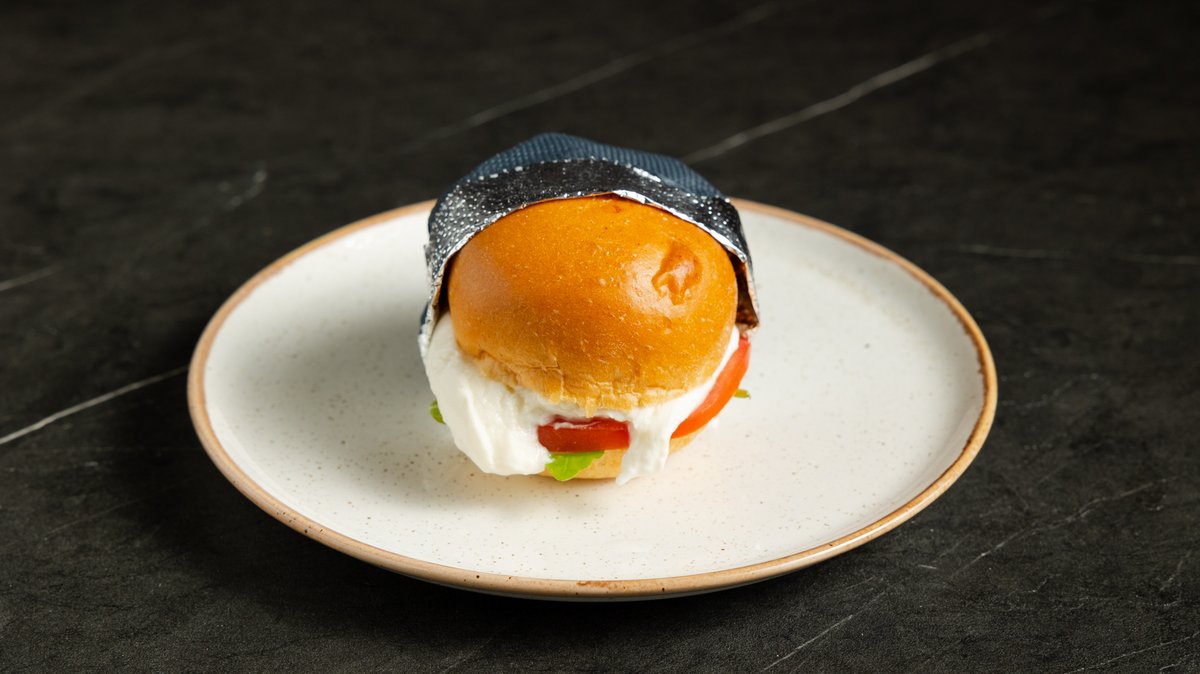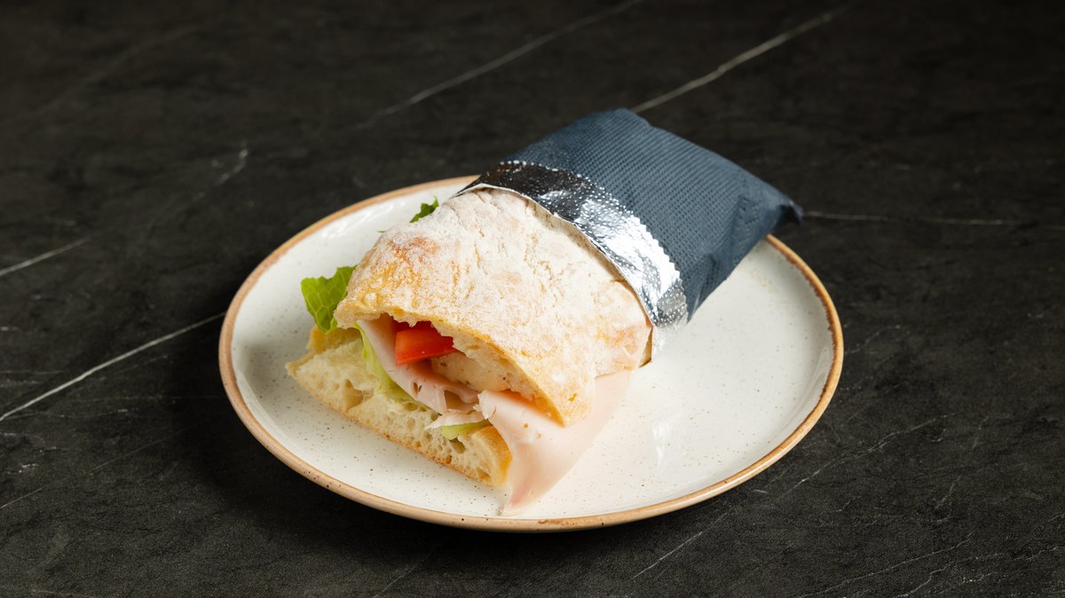 Με γαλοπούλα, black garlic cheese, μαρούλι, ντοματίνια και chimichurri mayo