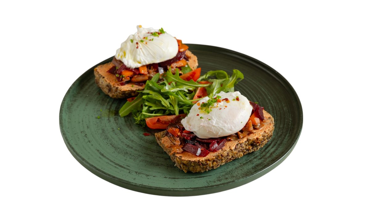 Ψωμί προζυμένιο με αυγά ποσέ, σολομός καπνιστός, guacamole και hollandaise sauce. Συνοδεύεται από ανάμεικτα πράσινα λαχανικά