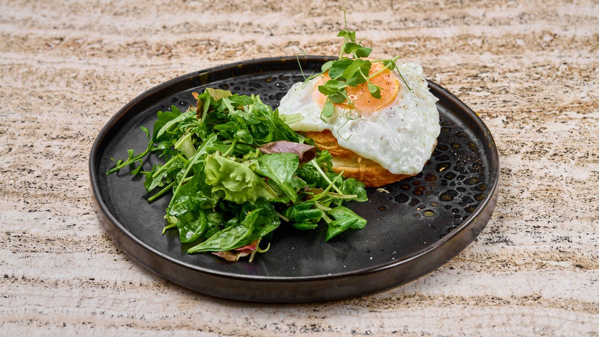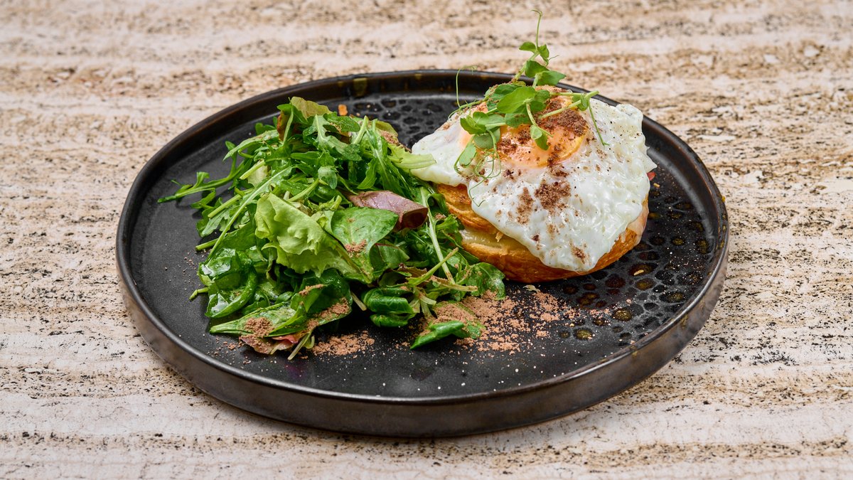 Με κρέμα τυριού, αβοκάντο, καπνιστή πανσέτα, αυγό. Συνοδεύεται από πράσινη σαλάτα
