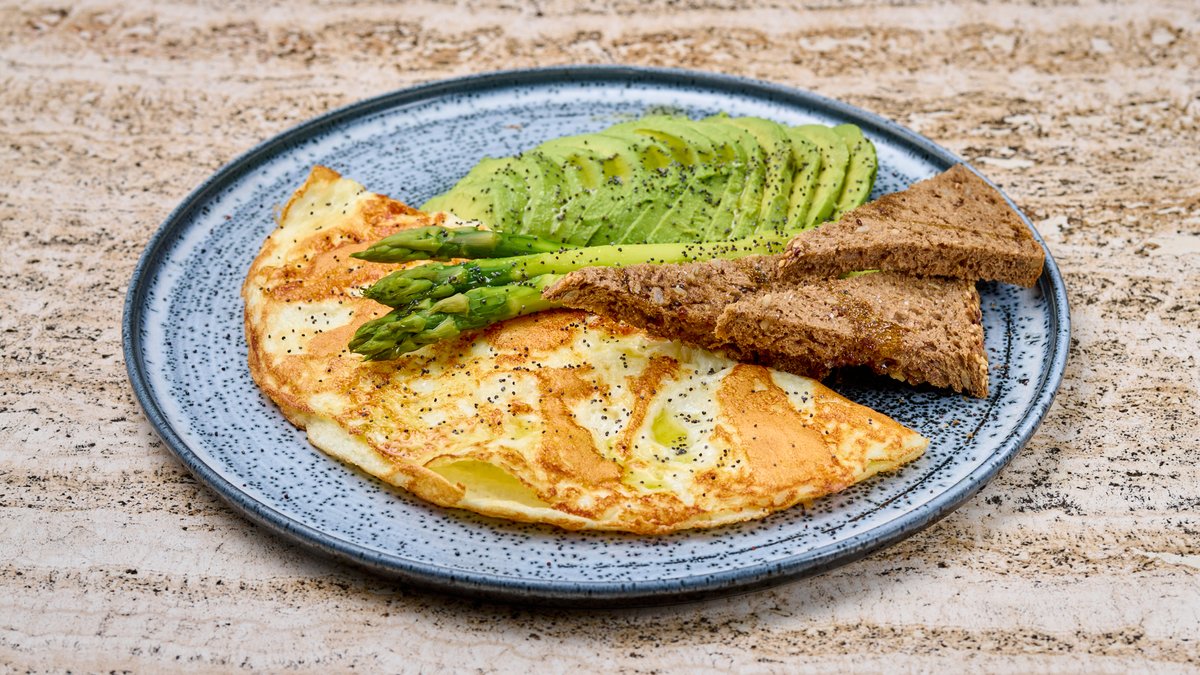 Με ασπράδια αυγού, πολύσπορο ψωμί, ψητά σπαράγγια, παπαρουνόσπορο