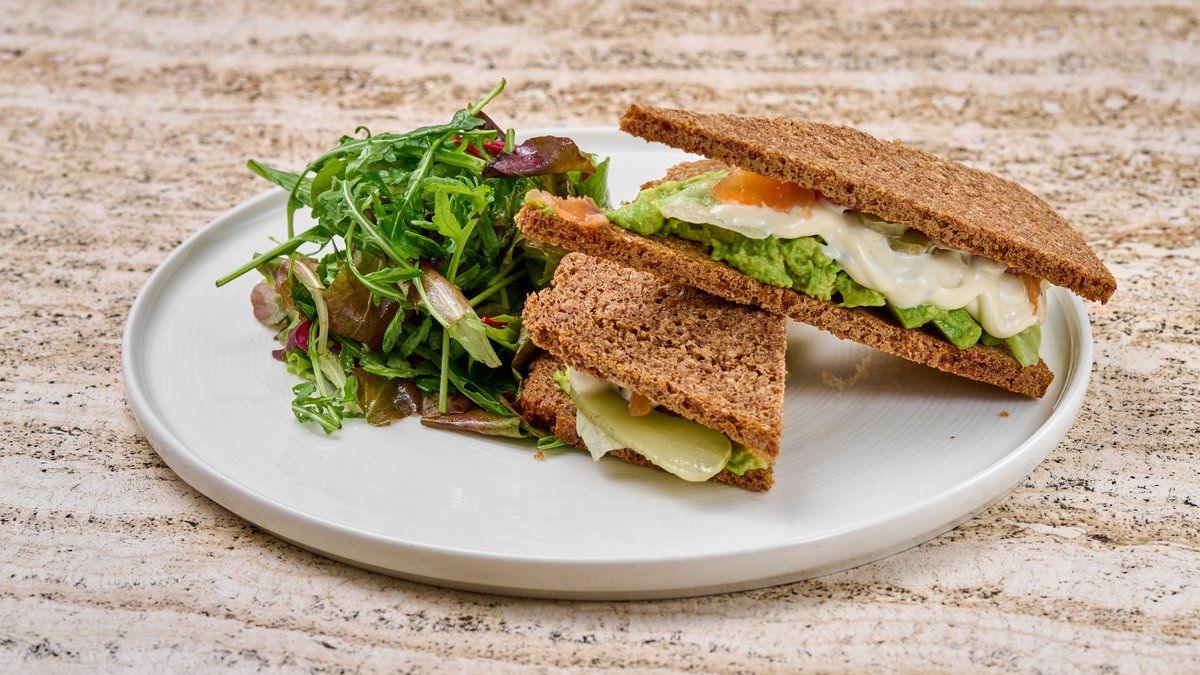 Με βιολογικό πολύσπορο ψωμί, gravlax σολομού, αβοκάντο, κρέμα lime, φύλλα iceberg. Συνοδεύεται από πράσινη σαλάτα