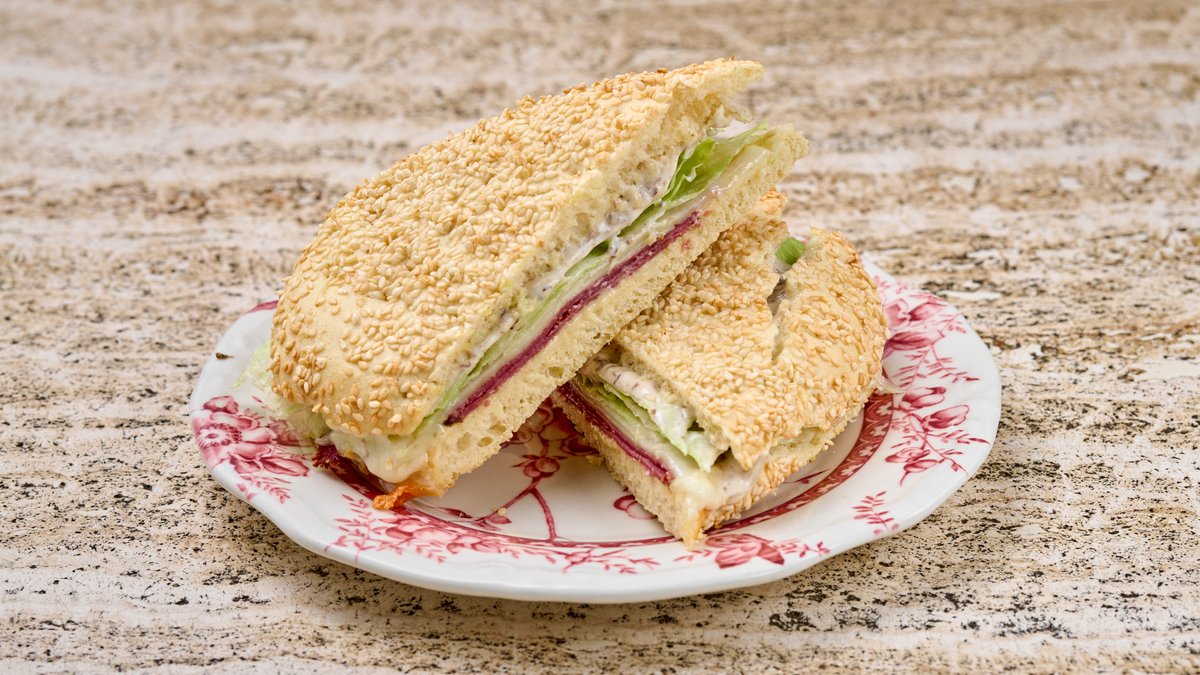 Με bun n’ roll bread, τυρί asiago, prosciutto cotto. Συνοδεύεται από πράσινη σαλάτα.