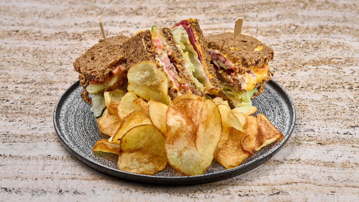Με φρυγανισμένο πολύσπορο ψωμί, καπνιστή πανσέτα, μοσχαρίσιο παστράμι, κρέμα cheddar, ντομάτα, μαγιονέζα, πίκλα αγγουριού, φύλλα iceberg. Συνοδεύεται από chips πατάτας.