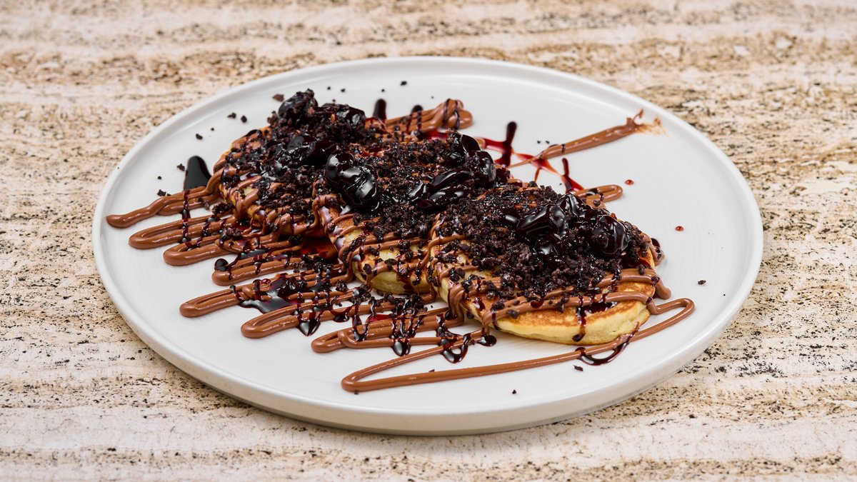 Με πραλίνα σοκολάτας, γλυκό κουταλιού βύσσινο, τριμμένο μπισκότο Oreo