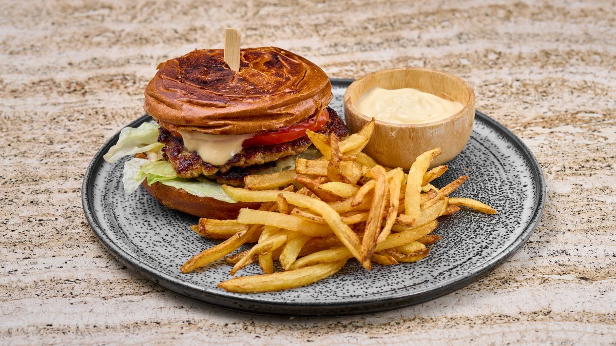 Με μπιφτέκι γαλοπούλας, ψωμί brioche, ντομάτα, iceberg και sweet chilly mayo sauce. Συνοδεύεται από πατάτες τηγανητές