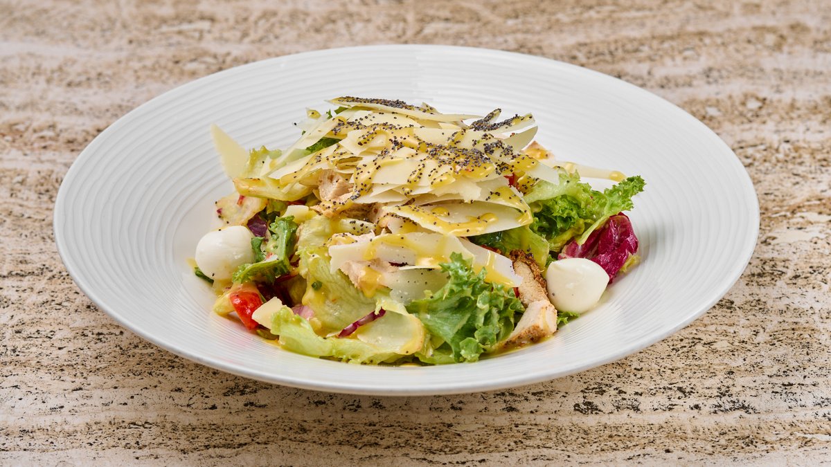 Ανάμεικτη σαλάτα με καπνιστό κοτόπουλο Μάνης, ημίλιαστη ντομάτα, ντοματίνια, mango, flakes παρμεζάνας, παπαρουνόσπορος, vinaigrette mango