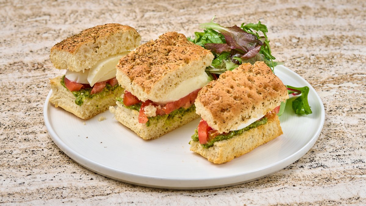 Με foccacia, φρέσκια ντομάτα, άνυδρα ντοματίνια Σαντορίνης, κρεμμύδι, ανθός κάπαρης, ρίγανη. 4 τεμάχια