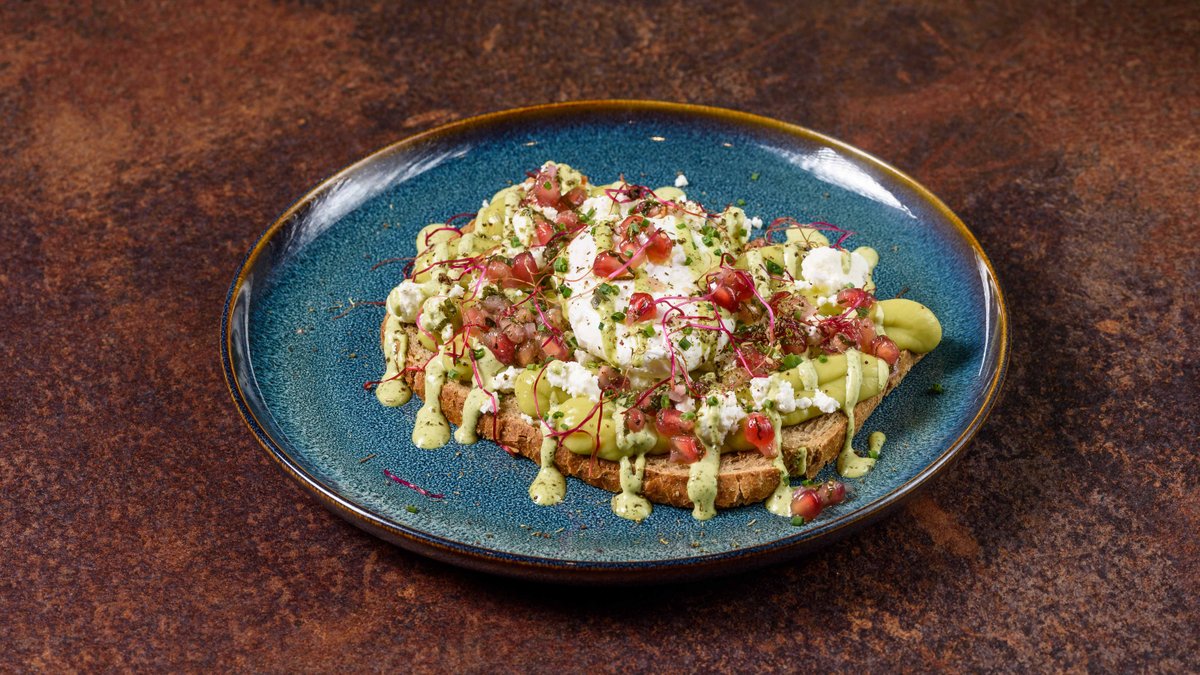 Σε προζυμένιο ψωμί με αυγά ποσέ, salsa ροδιού, φέτα τριμμένη, μαγιονέζα άνηθου και ζαατάρ