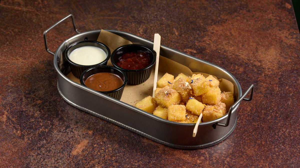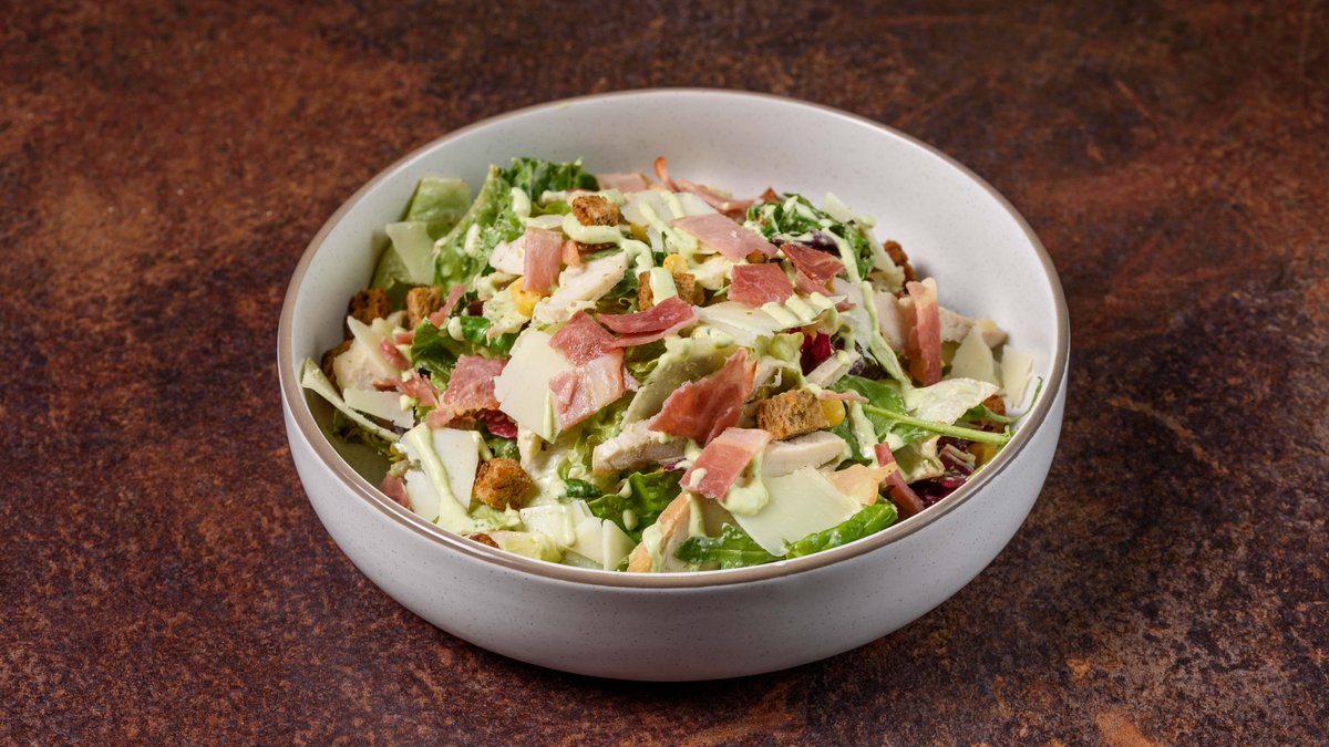Με κοτόπουλο λωρίδες, φλοίδες γραβιέρας, κρουτόν πάπρικας, μπέικον, καλαμπόκι και ceasar sauce