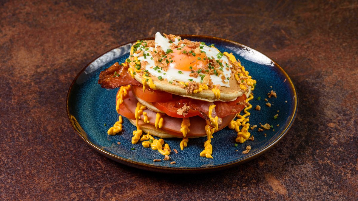 Με μπέικον, καπνιστό χοιρινό, αυγό τηγανητό, ντομάτα, cheese sauce και τραγανά κρεμμύδια