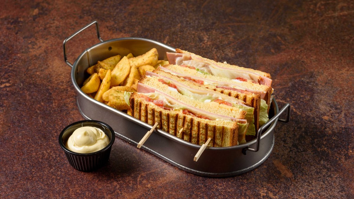 Με brioche, καπνιστό χοιρινό και μπέικον, αυγό βραστό, iceberg, ντομάτα, κασέρι & μαγιονέζα