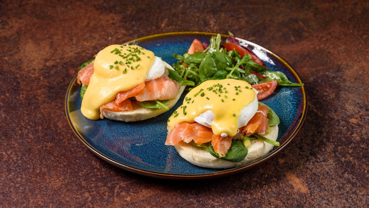 Με καπνιστό σολομό σε αφράτο muffin, baby σπανάκι, κρέμα αβοκάντο και σάλτσα ολλανδέζ