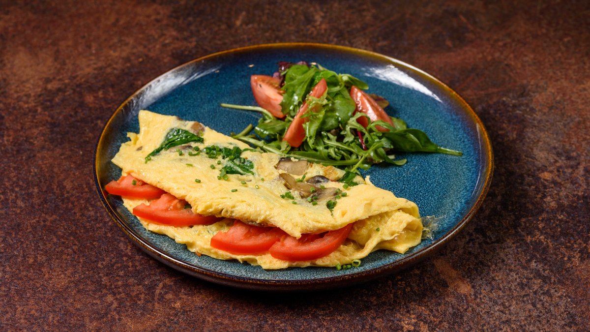 Με άγρια μανιτάρια, μπέικον, ντομάτα, τυρί και ανάμεικτη σαλάτα
