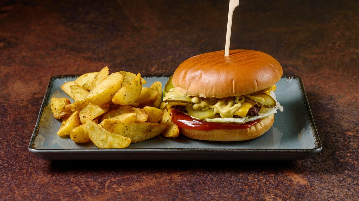 Ψωμί brioche με μπιφτέκι black angus, τυρί κατσικίσιο, καραμελωμένο κρεμμύδι, πίκλα αγγουριού, iceberg, ντομάτα & sauce μαγιονέζα τρούφα. Συνοδεύεται από γαρνιτούρα της επιλογής σας