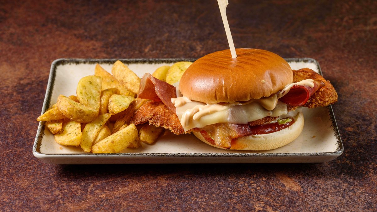 Ψωμί brioche με φιλέτο κοτόπουλο πανέ, μπέικον, coleslaw, σάλτσα τυριών & μαγιονέζα χίλια νησιά