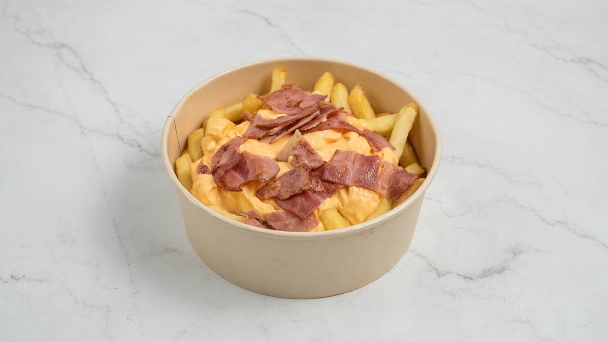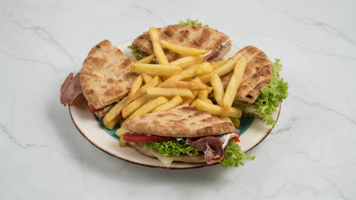 Με ζαμπόν, edam, μπέικον, ντομάτα και μαγιονέζα. Συνοδεύεται από πατάτες τηγανητές και ketchup