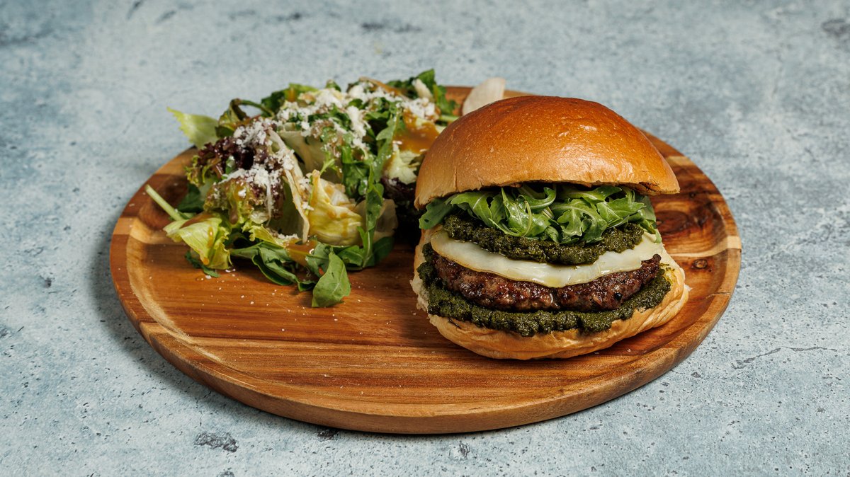 Με μπιφτέκι 180 g, τυρί provolone, ρόκα και chimichurri sauce. Συνοδεύεται από πράσινη σαλάτα με τριμμένη παρμεζάνα και balsamic vinaigrette. Σε ψωμί ολικής