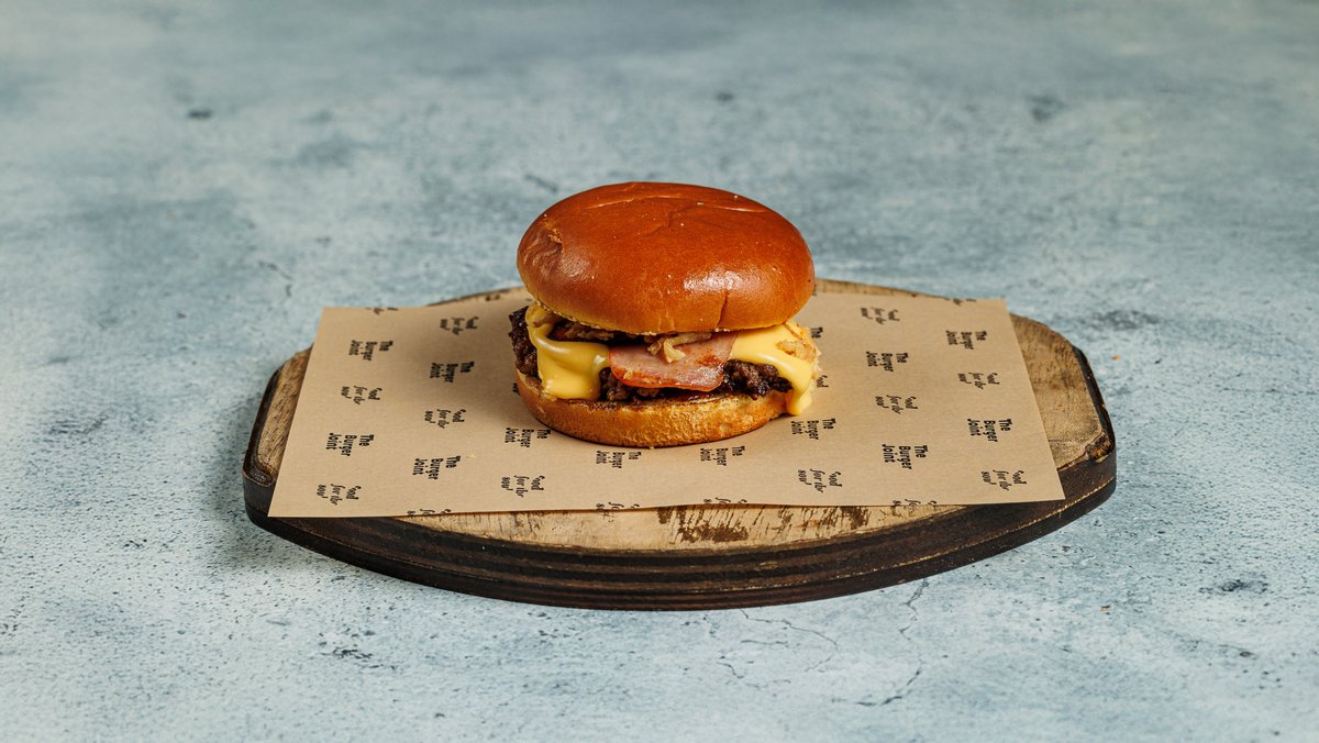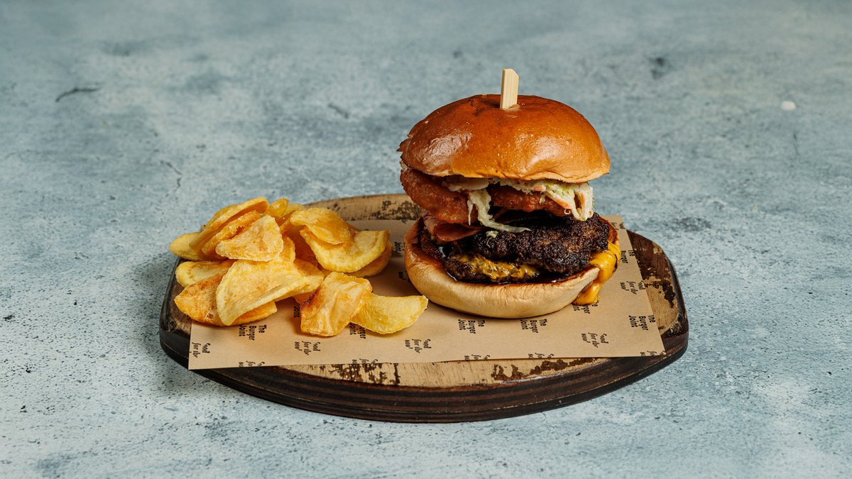 Ψωμί brioche με διπλό smash black angus beef, Διπλό cheddar, διπλό bacon, bourbon bacon marmalade και smash mayo. Συνοδεύεται από chips πατάτας