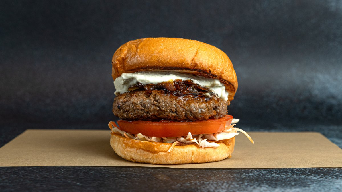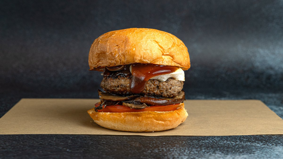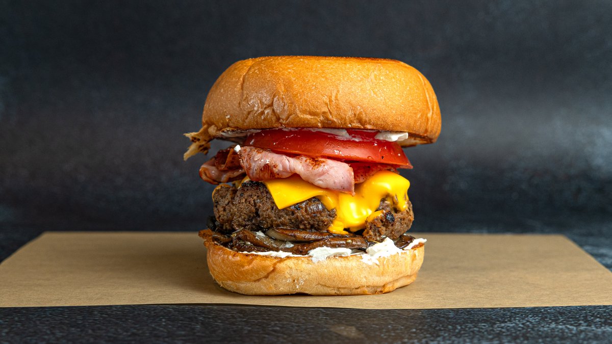 Τριπλό 100% μοσχαρίσιο smashed μπιφτέκι, τσένταρ, μπέικον, μανιτάρια σωτέ, truffle mayo και onion rings.