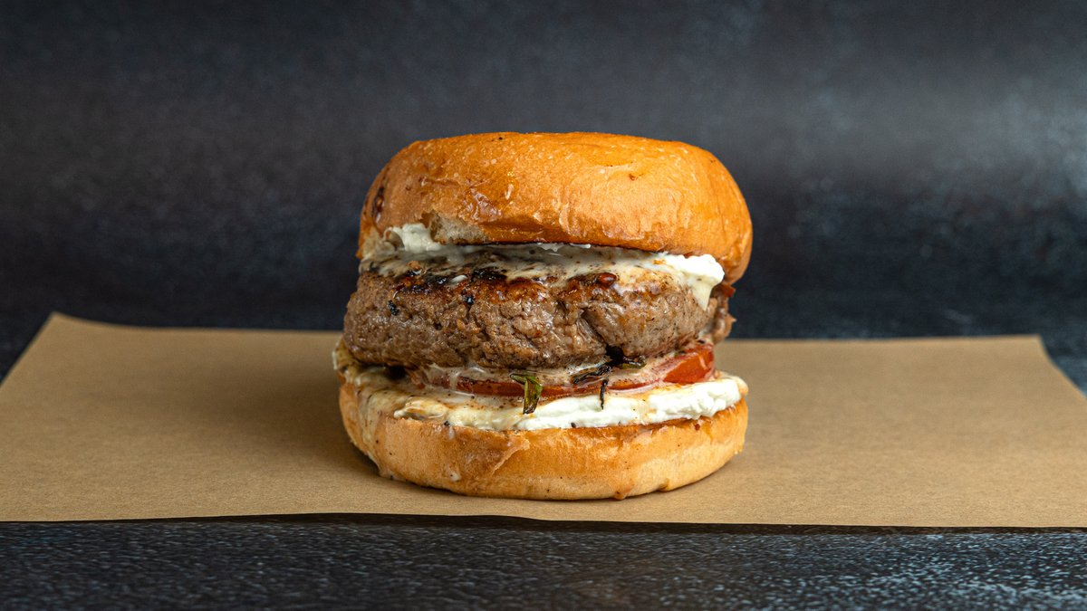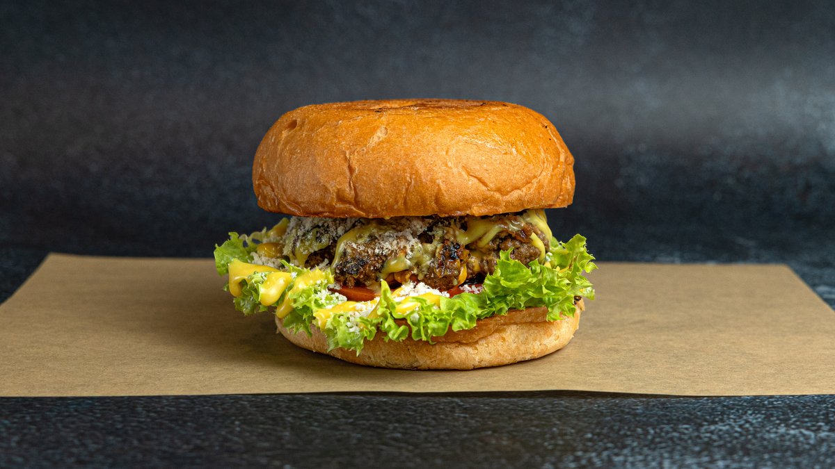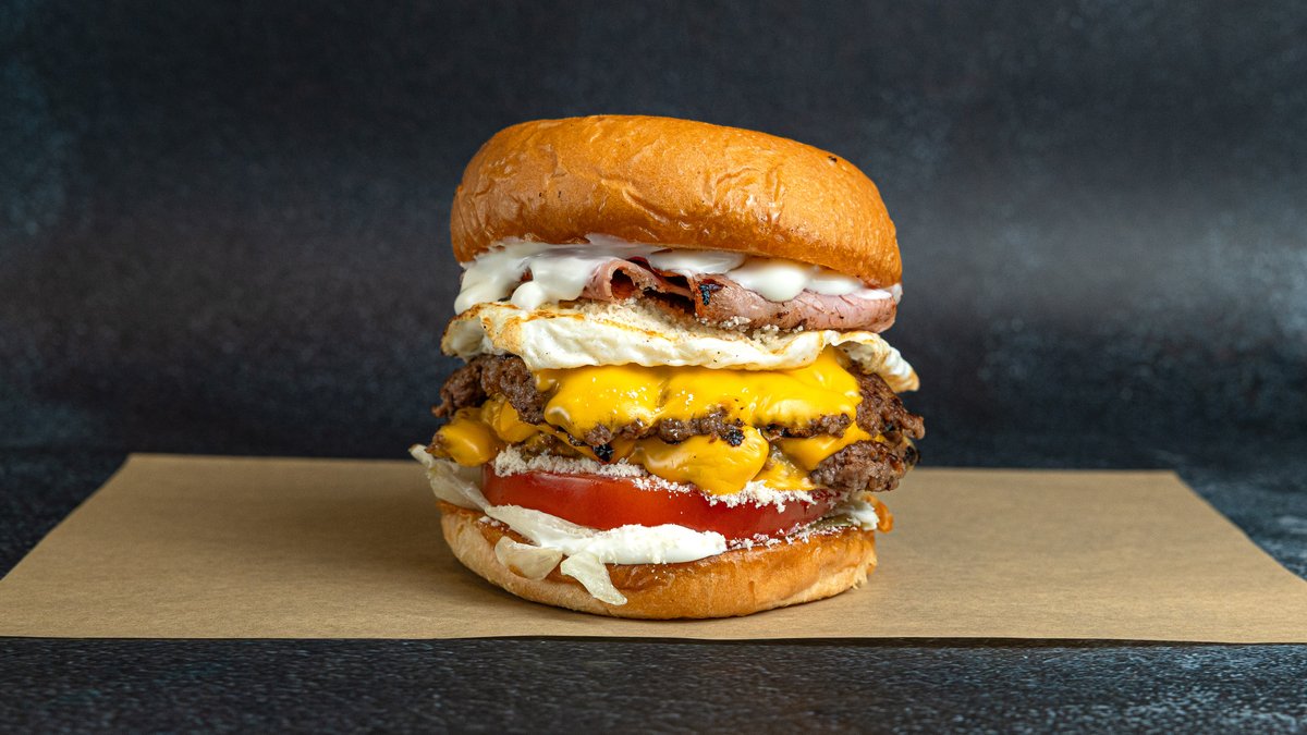 Διπλό 100% μοσχαρίσιο smashed μπιφτέκι, τσένταρ, ντομάτα, iceberg, αυγό τηγανητό, μπέικον, μαγιονέζα και παρμεζάνα