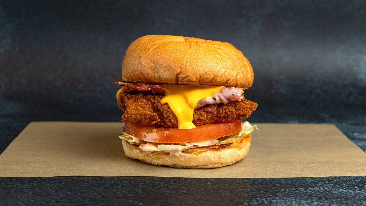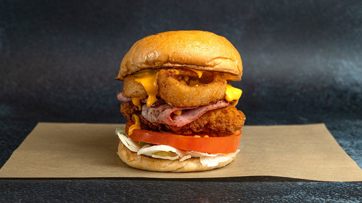 Κοτόπουλο πανέ, κρέμα τσένταρ, μπέικον, ντομάτα, iceberg, μαγιονέζα, bbq και onion rings