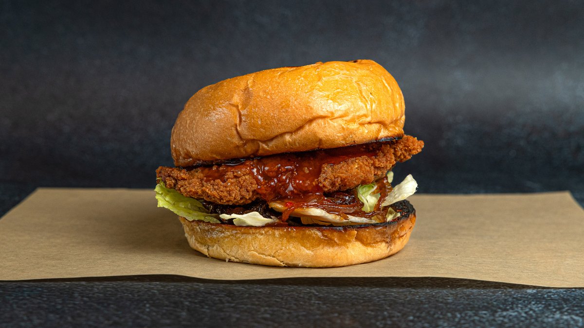 Διπλό 100% μοσχαρίσιο smashed μπιφτέκι, τσένταρ, ντομάτα, iceberg, bbq sauce, πίκλα κρεμμυδιού και onion flakes
