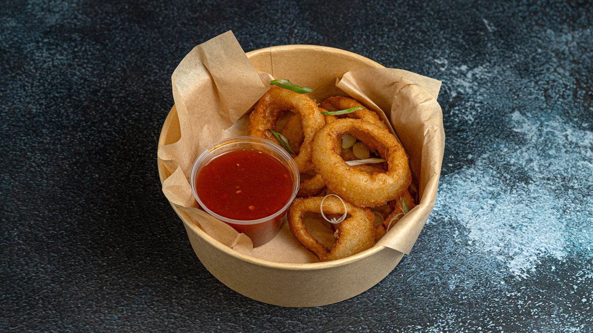Ροδέλλες κρεμμυδιού με sweet chilly sauce