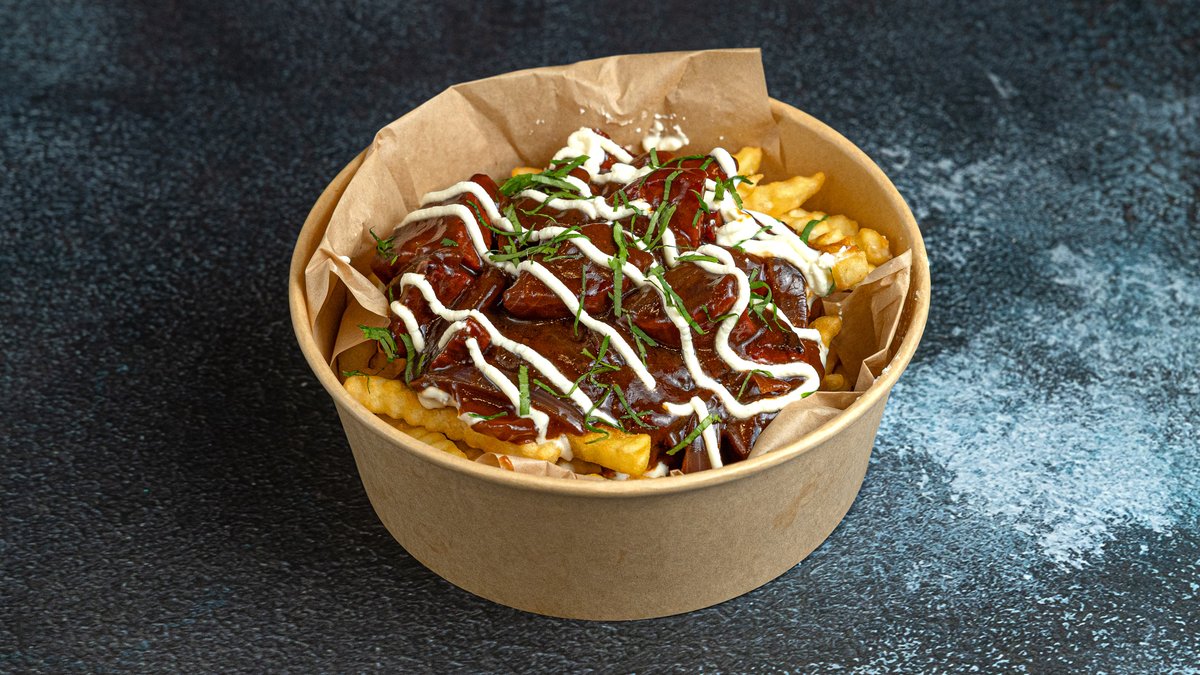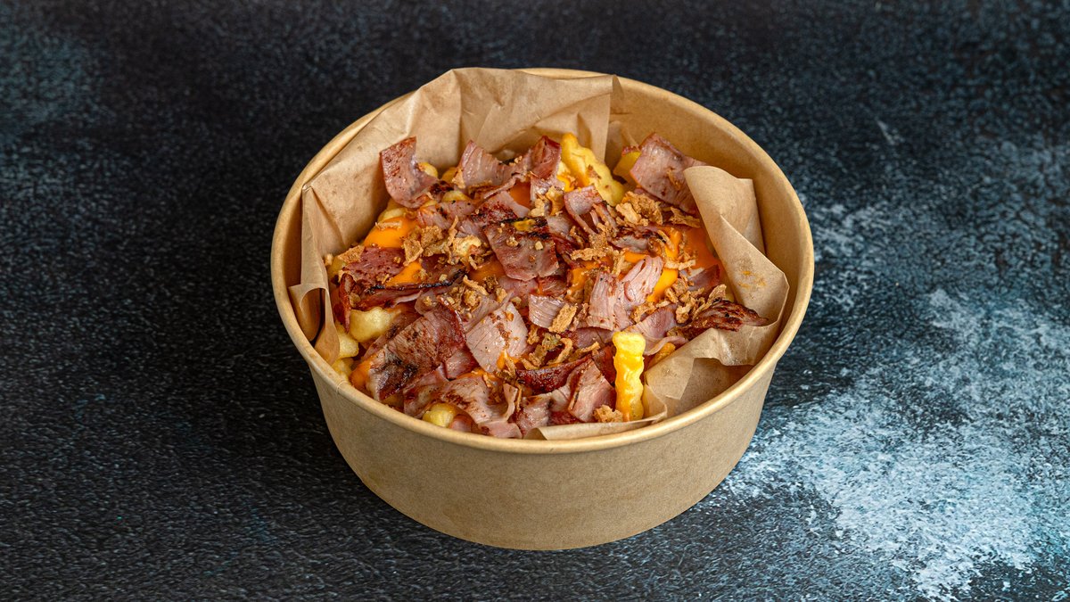 Τηγανητές πατάτες με cheddar sauce, ψιλοκομμένο μπείκον και onion flakes