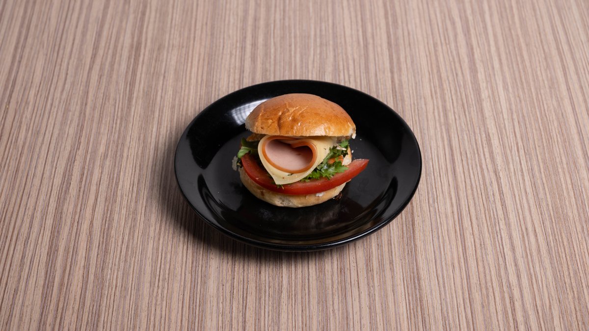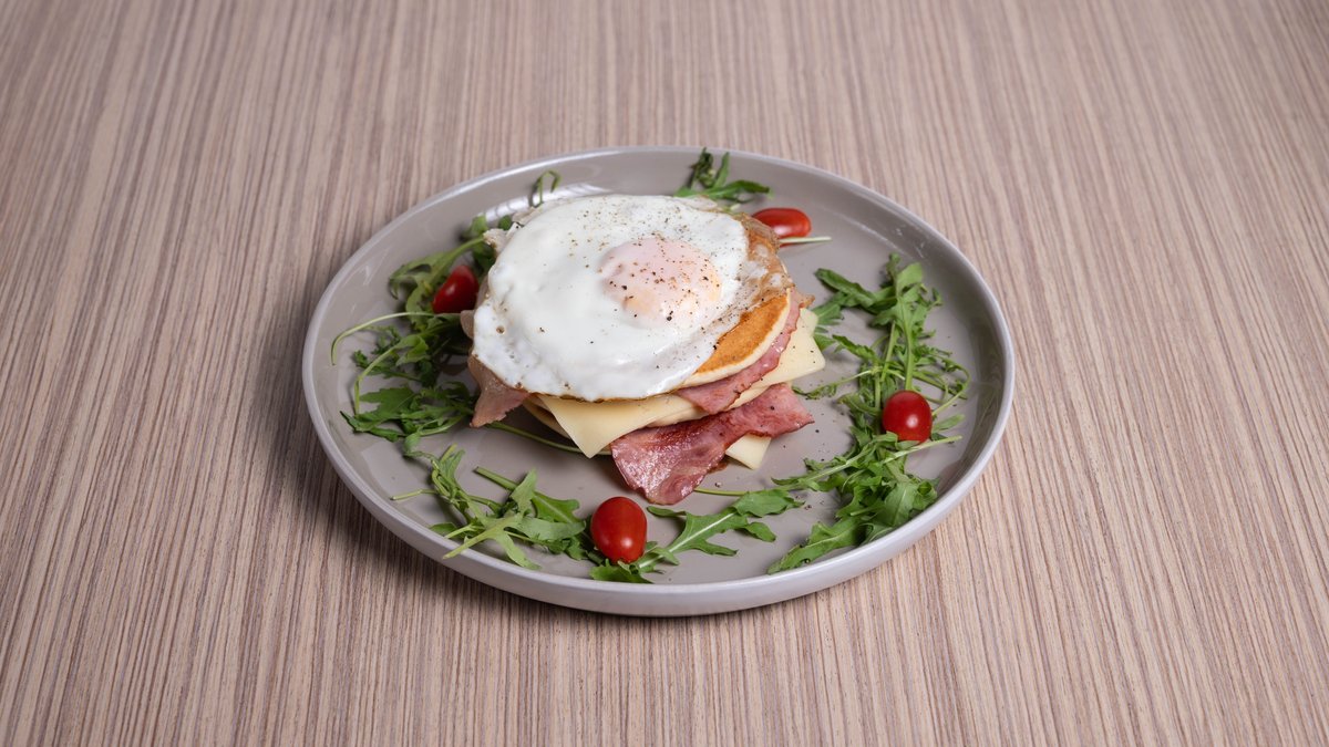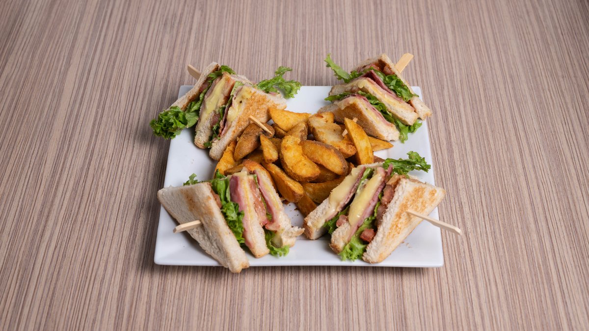 Ψωμί λευκό φρυγανισμένο με gouda, ζαμπόν, τραγανό μπέικον, ντομάτα και μαρούλι. Συνοδεύεται από πατάτες τηγανητές και dip sauce μαγιονέζας