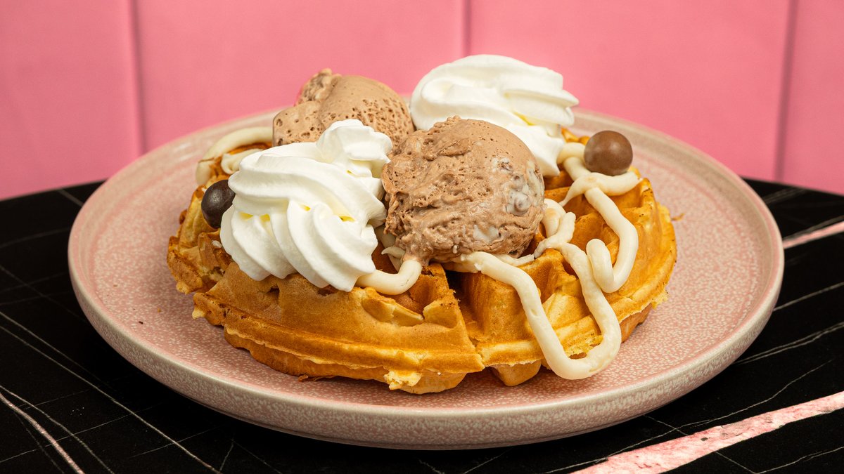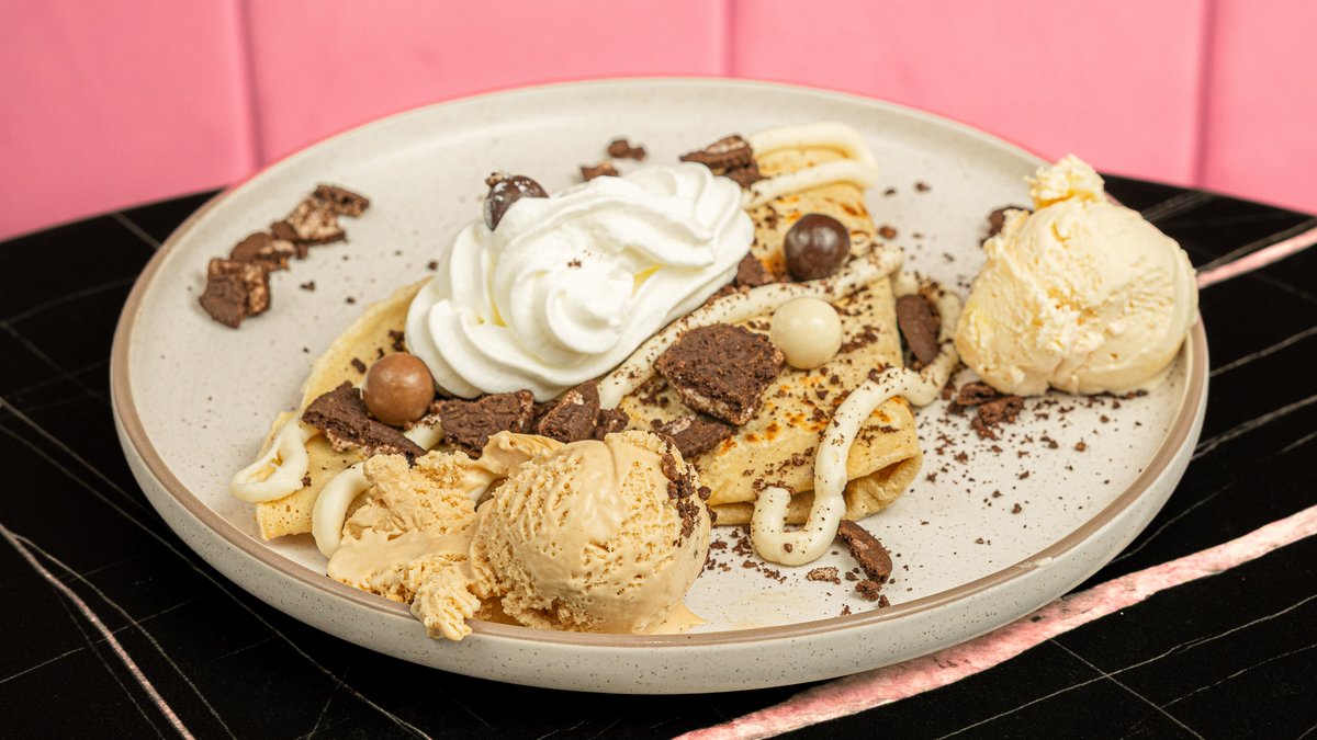 Με πραλίνα λευκή, σοκολάτα γάλακτος, τριμμένο μπισκότο oreo, σαντιγύ, τρούφα σοκολάτα γάλακτος και 2 μπάλες παγωτό της επιλογής σου