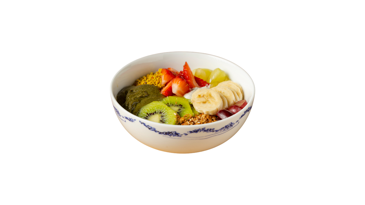 Με τριμμένο μπισκότο, μπανάνα, φράουλα, blueberries, σαντιγύ και πραλίνα της επιλογής σου
