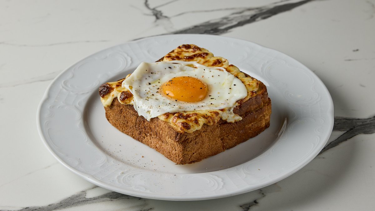 Brioche ψωμί, μουστάρδα dijon, edam, καπνιστό χοιρινό, 1 αυγό μάτι, σως