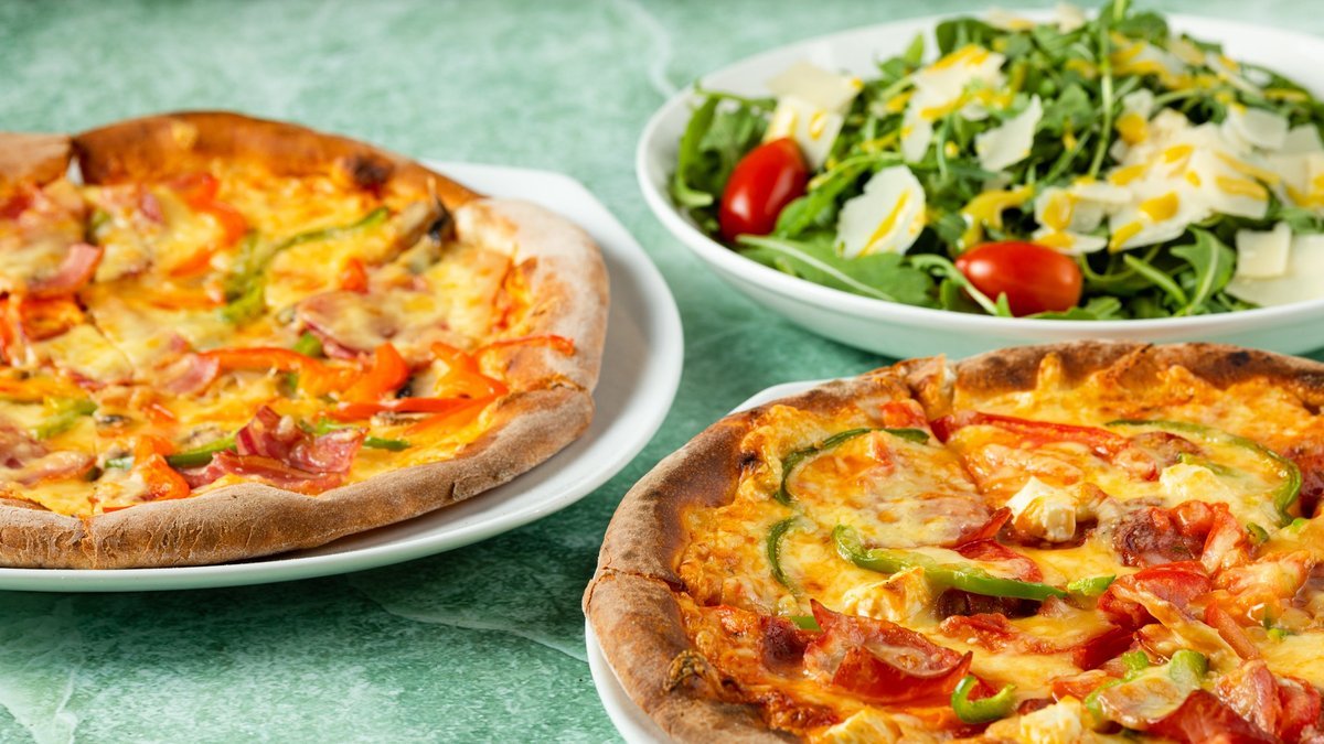 Με σάλτσα ντομάτας, τυρί gouda, edam, φέτα, πράσινη πιπεριά, ελιές, κρεμμύδι και φρέσκια ντομάτα