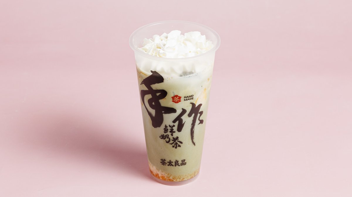 Με matcha με γάλα, φρέσκο mango και κρέμα