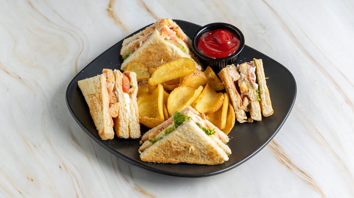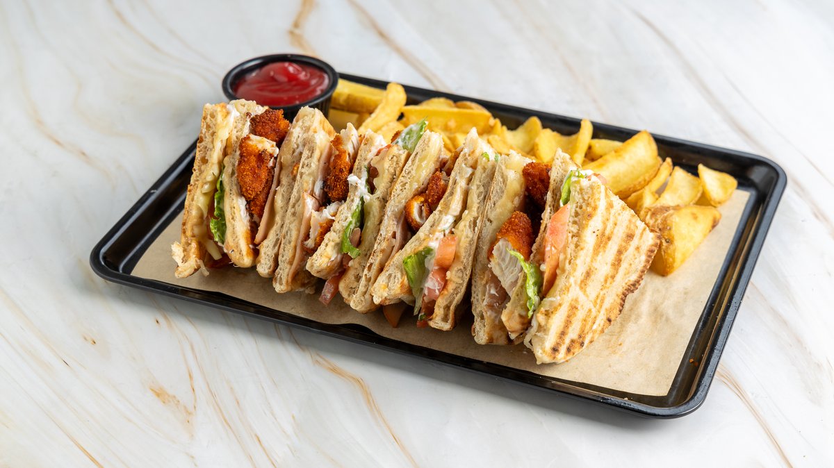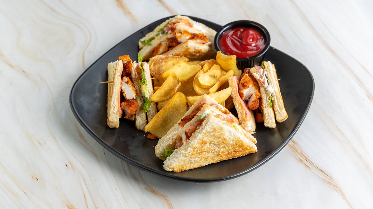 Με κοτομπουκιές, edam τριμμένο, ζαμπόν, ντομάτα, μαρούλι και μαγιονέζα. Συνοδεύεται από πατάτες τηγανητές και dip ketchup